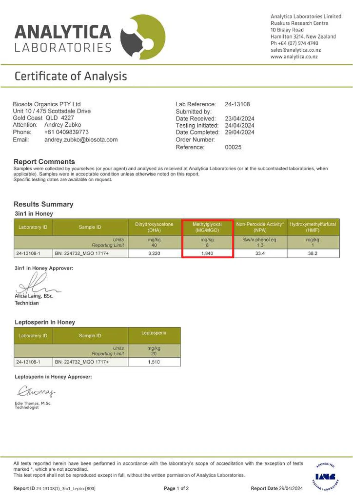 Dank der Tatsache, dass dieser Honig nicht gekocht wurde, bleiben alle wertvollen und wichtigen Inhaltsstoffe erhalten. Manuka-Honigist geprüft und zertifiziert fürnatürlicher MGO-Gehalt (Methylglyoxan).