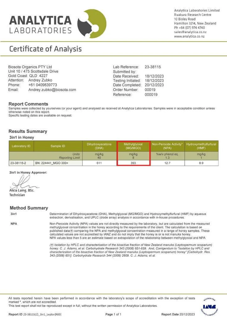 Dank der Tatsache, dass dieser Honig nicht gekocht wurde, bleiben alle wertvollen und wichtigen Inhaltsstoffe erhalten. Manuka-Honigist geprüft und zertifiziert fürnatürlicher MGO-Gehalt (Methylglyoxan).