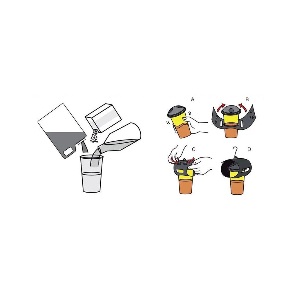 Bauen Sie die Falle entsprechend der Abbildung zusammen. Nach der Befüllung mit Hornissen oder 3 Wochen nach dem Aufstellen der Falle sollte die Lösung erneuert werden, ohne den Fallenkasten auszuspülen.
